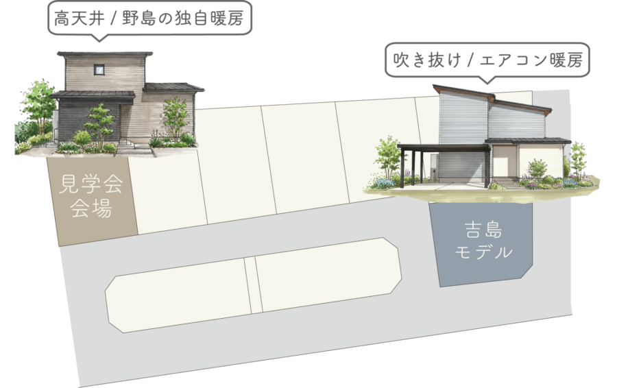 同じ分譲地内での開催のため、期間中、見学会会場は当社の独自暖房、吉島モデルハウスではエアコン暖房を運転、今回だけの特別な見学会です。
